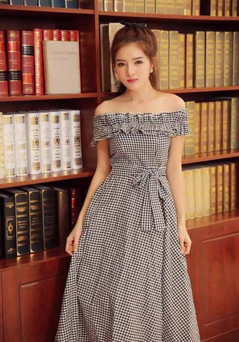 Đầm công sở caro hở vai