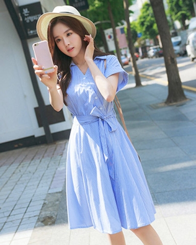 Đầm công sở kẻ sọc đẹp phù hợp với bạn gái nấm lùn