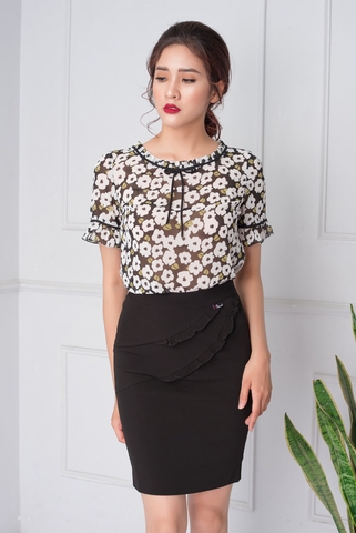 Phần áo bên trên được may từ vải voan, kết hợp ren ở cổ cùng đường nơ nữ tính. Hoạ tiết hoa lá vốn là hot trend trong mùa hè hiện nay cũng được tận dụng tối ưu, nhằm bắt kịp xu hướng thời trang cùng thị hiếu khách hàng liên tục thay đổi. Phần chân váy màu đỏ, trơn, kiểu dáng chữ A khá đơn giản. Form váy này phù hợp với vóc dáng của hầu hết chị em, che đi những khuyết điểm ở mông, eo hay đùi.
