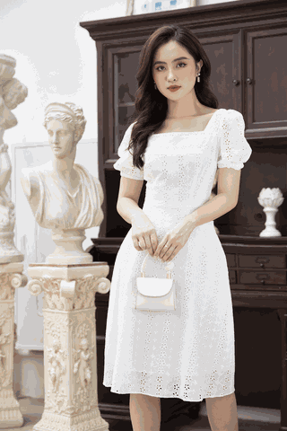 Bên cạnh đó, chị em mệnh Thủy cũng có thể chọn mẫu đầm trắng chất liệu xước lót thun dưới đây. Mẫu thiết kế này sở hữu cổ vuông gợi cảm cùng hai tay phồng nhẹ nhàng. Có thể phối túi xách, phụ kiện làm tăng thêm tính thời trang, thẩm mỹ.