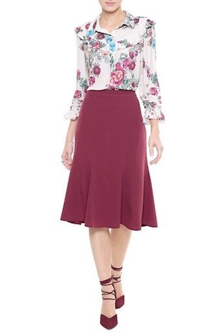 Chân váy xòe dáng dài được may bằng chất liệu mềm rủ như voan, chiffon,lụa…Bạn nhớ kết hợp giày mũi nhọn dáng cổ điển để bộ trang phục công sở hoàn hảo.