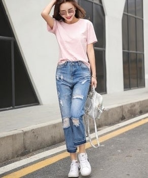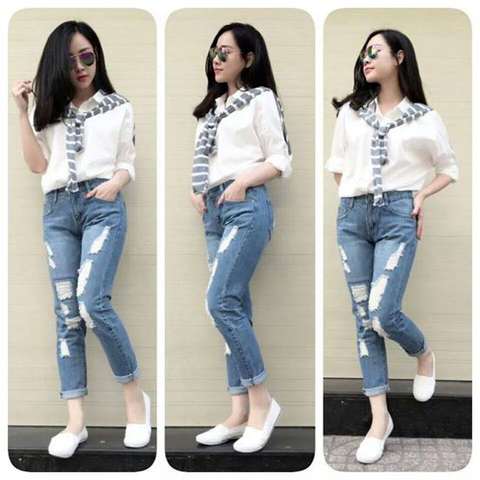 Làm thế nào để có thể sở hữu dáng vẻ xinh đẹp và năng động với mẫu quần jeans rách? Rất đơn giản! Bạn chỉ cần lựa chọn cách phối đồ với quần jeans rách chung với áo khoác jean hay áo thun có họa tiết bắt mắt là được. Nó không chỉ mang đến cho bạn vẻ đẹp khỏe khoắn, năng động mà còn rất mạnh mẽ nữa. Đây sẽ là ý tưởng kết hợp trang phục cực “chất” mà các cô nàng Tomboy không thể chối từ để có được dáng vẻ hoàn hảo như những gì mình mong muốn.